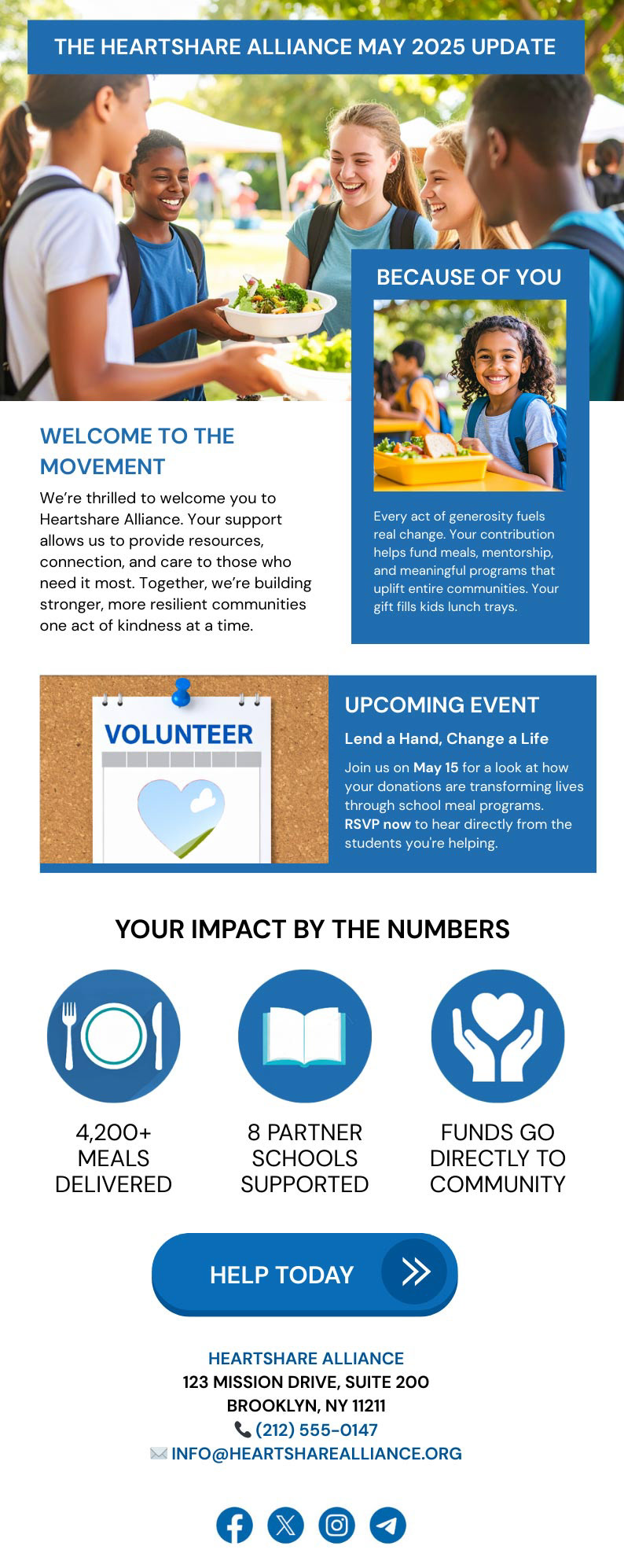 Heart Alliance Donor Email! This donor email was designed as part of a nonprofit engagement campaign for Heartshare Alliance, an organization supporting school meal programs and community resilience. The layout blends compelling storytelling with clear calls to action, highlighting donor impact through powerful visuals, key stats, and an emotional appeal.